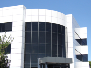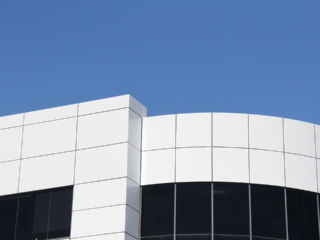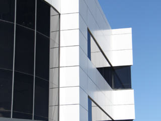 Canon Building, Warehouse Way. Reclad of the West elevation. COLOUR: Traffic white. PRODUCT: Reynodual. NOTE: Reynodual has been superseded with Alucolux.