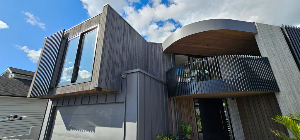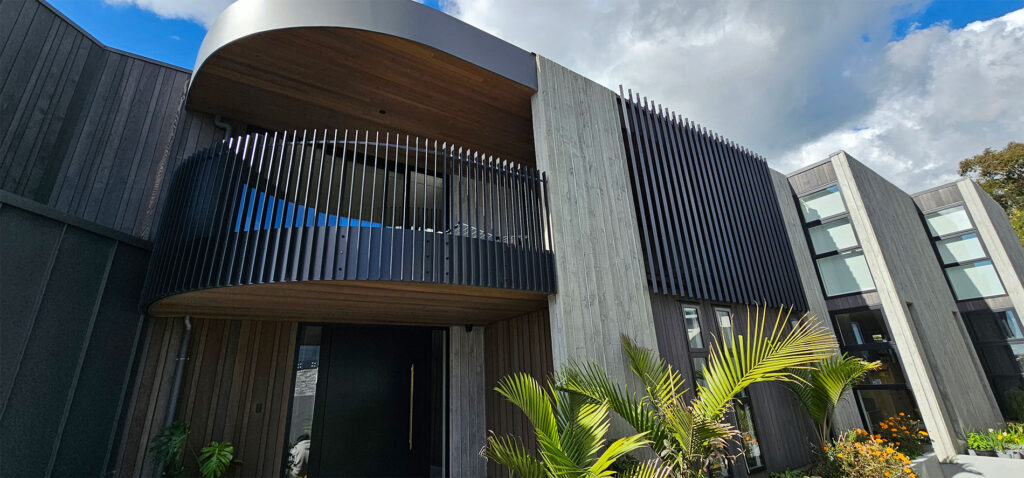Architect: Design Space | Products Installed: Louvres (powder coated matt flaxpod), screens for lift shaft (powder coated matt black), balustrades – (powder coated matt flaxpod), curved flashings (powder coated matt flaxpod)