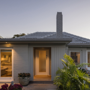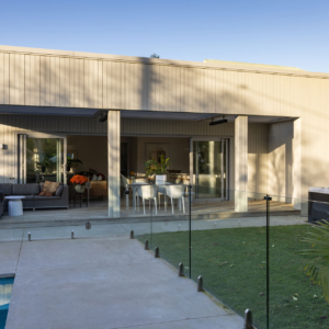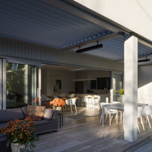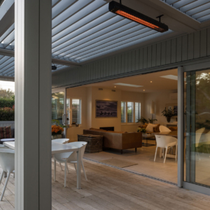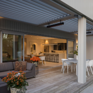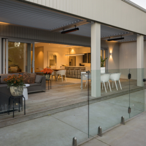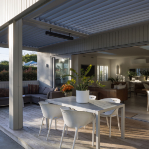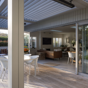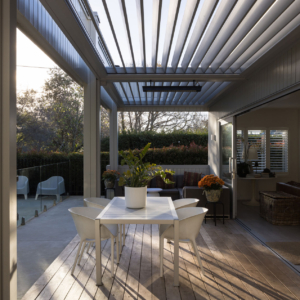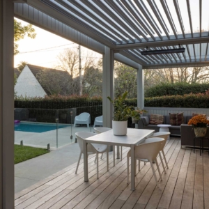 Aero Louvres, black aluminium pool fence, and glass balustrade with gate (around the pool) in the back garden.