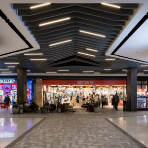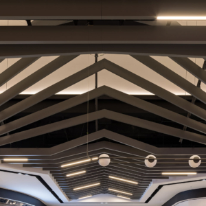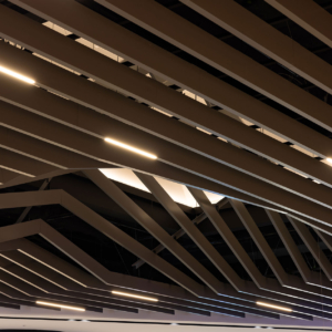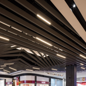PRODUCT & COLOUR: ACMF Proprietry 200×50 Quadro Louvres in Matt Sandstone Grey. STRUCTURE: Rondo Suspended Ceilings system with specialised Seismic Bracing.