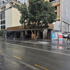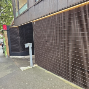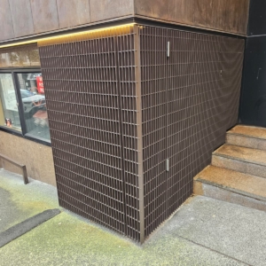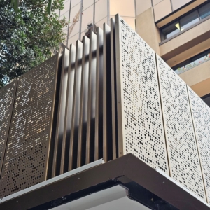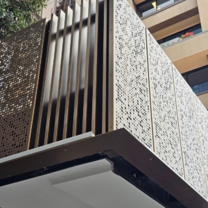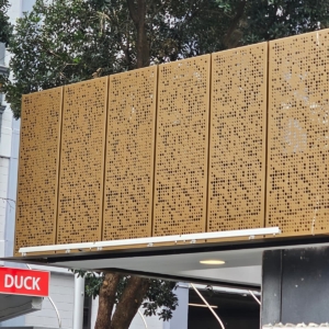 Bronze/Copper Webforge screens installed to underground carpark entrance and Shortland entrance way, with sliding and standard doors integrated into the system. | Products Installed: Aluminium Grating (Webforge) & Operable Louvre: Window Bronze. Aluminium perforated screen: bronze copper.